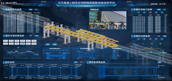 该智能顶推安全监控系统平台是由日韩欧美福利视频_黑人巨大人精品欧美三区_欧美成人另类人妖_欧美在线精品一区二区三区_欧美一区二区三区性视频_日韩精品欧美视频_性欧美极品xxxx欧美一区二区完全自主研发的在线监测系统,以结构安全和施工过程预警为导向,深度融合了物联网、大数据、云/边缘计算、人工智能以及数字孪生等先进理念,可广泛应用于桥梁、房屋、隧道、边坡等结构安全在线监测与健康管理。该系统利用云平台共享技术,通过预设无线传输设备模块,实现了监测数据融合、三维施工模拟、参数阈值预警等多项功能。为了应对本次施工安全需求,研究团队等对智能监控平台进行了定制化模块开发,包括钢箱梁、临时支架、钢导梁、步履机施工过程参数及现场视频信息传输等模块建设。结合无线传输和实时数据采集技术,实现了钢箱梁顶推过程中主要参数的实时监测。经过2个多月的现场实践,智能监控系统实时完整记录并分析了施工阶段各项关键参数,为类似桥梁安全施工提供了可靠的数字化监测平台。