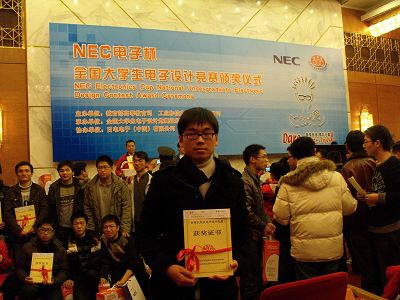 合肥学院荣获2009年NEC杯全国大学生电子设计竞赛一等奖(张悦龙同学代表我院参赛队在人民大会堂领奖)