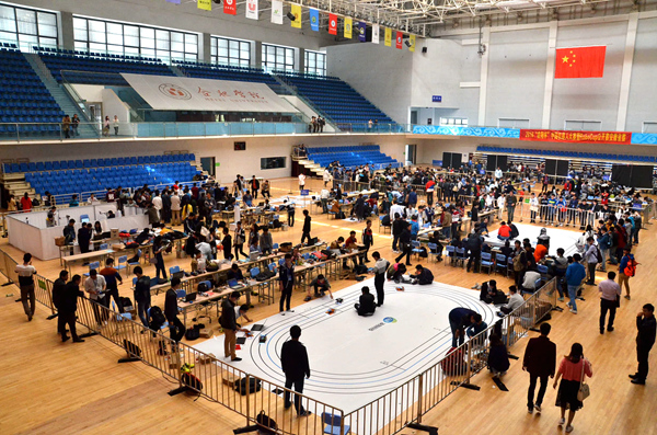 在开幕式顺利举办后,本次大赛于体育馆主馆正式开始。各参赛队伍在仿人机器人短跑比赛、仿人机器人单人或多人舞蹈比赛、智能停车购物等10个大项、12个小项间展开激烈角逐。我校来自计算机科学与技术系卓越IT工程师俱乐部、由计科系教师高玲玲、张贯虹指导的四支队伍参与此次大赛。比赛现场选手们皆心无旁骛,全神贯注,不断调试数据,力争让参赛机器人发挥出最佳水平。经过历时近两日的比拼,比赛最终落下帷幕,我校代表队分别在仿人机器人短跑比赛与仿人机器人障碍跑比赛中荣膺冠军。