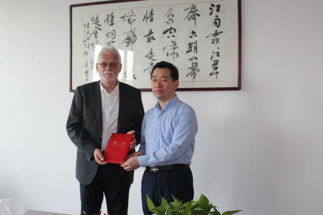 张文兵校长为克劳斯•比尔申科颁发客座教授聘书