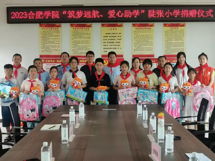 为助力乡村教育振兴,巩固拓展脱贫攻坚成果,7月7日,我校赴泗县陡张村和惠庙村开展2023年“筑梦远航 爱心助学”捐赠活动。校党委组织部正处级组织员周全、外国语学院党委书记吴孔宝、团委副书记李妍妍、党委组织部副处级组织员张海卿和当地乡镇、小学领导出席捐赠仪式,当地小学生代表和我校学生志愿者代表参与仪式。仪式分别在陡张小学和惠庙小学举行。